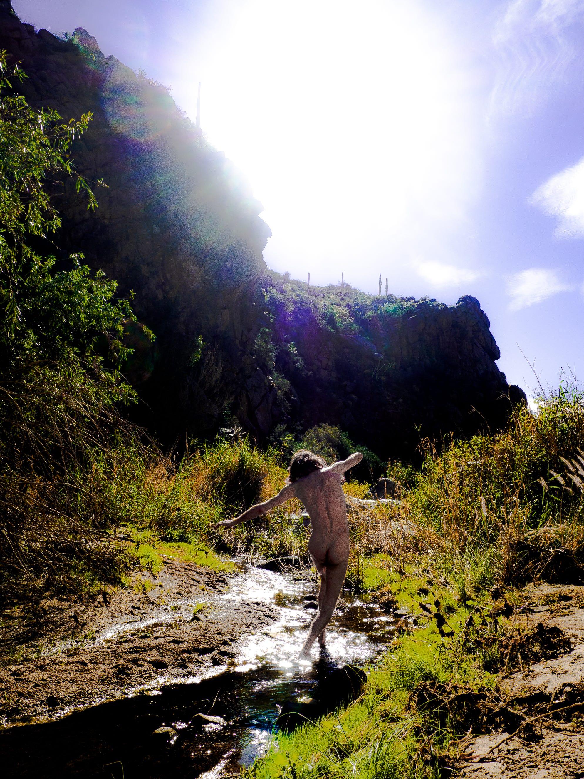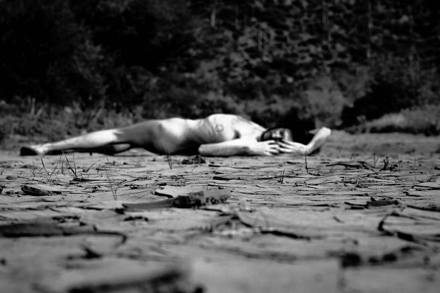 The ground already lives sensual, it is already One with its Self. To lie here is to be softened while supported. To become the very water itself that this cracked soil has awaited. The skin, velvet, glides - and we both are longing… This Earth knows the blood that flows in you, is the same water that looms in overhead storm clouds. Our own weathered bodies…